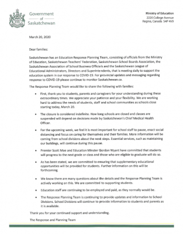 March 20, 2020 -- The Saskatchewan Education Response Planning Team just posted this letter for all parents and families to read. Please review the document here.