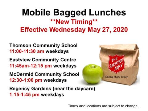 PLEASE TAKE NOTE: The schedule for our mobile lunch program will be changing on Wednesday May 27th as we add a new location stop at Eastview Community Centre.