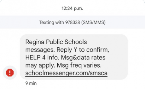 January 17, 2022 -- Did you receive this message? It is legitimate. Parents/guardians and emergency contacts of Regina Public Schools students may receive this text message to voluntarily opt in for the family communication (text) system. Text messages are only used for urgent communication to families.