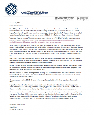 January 28, 2022 -- The attached letter from the Director of Education will be sent to all school families today. It is in response to changes announced by the Government of Saskatchewan related to self-isolation and close-contact protocols.